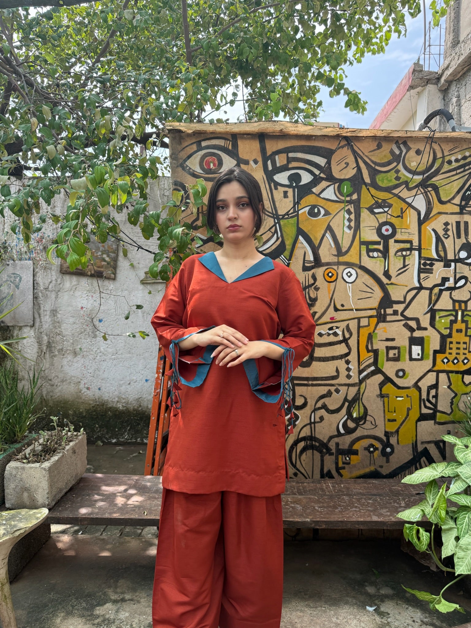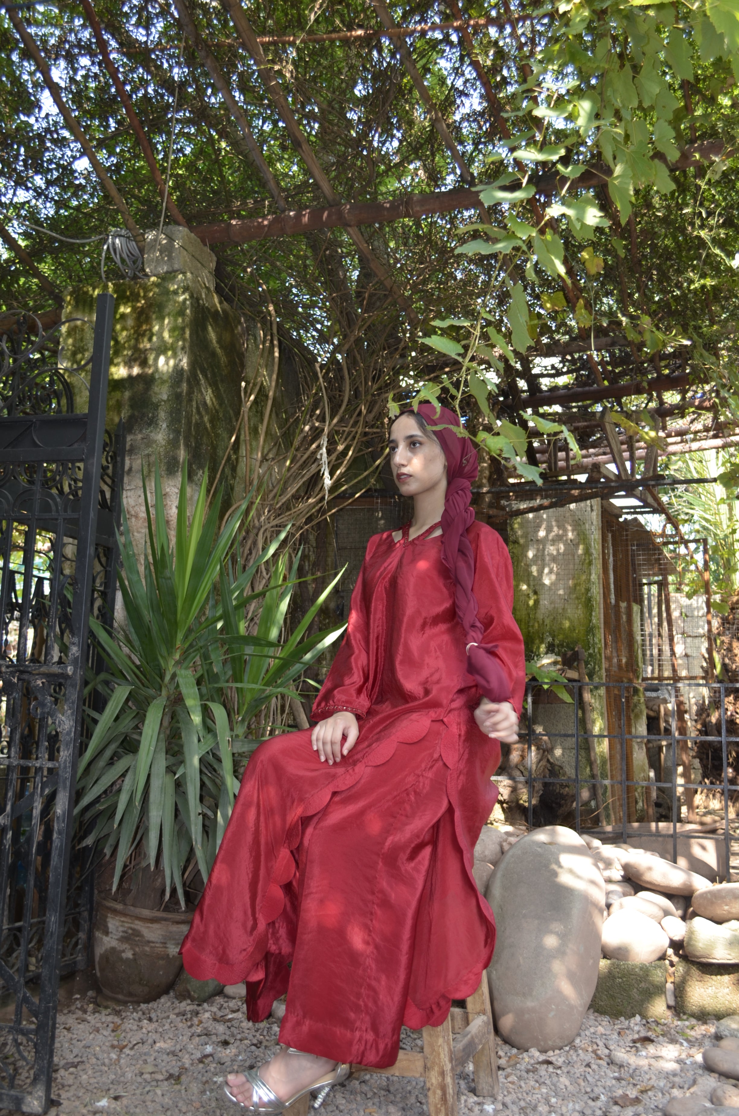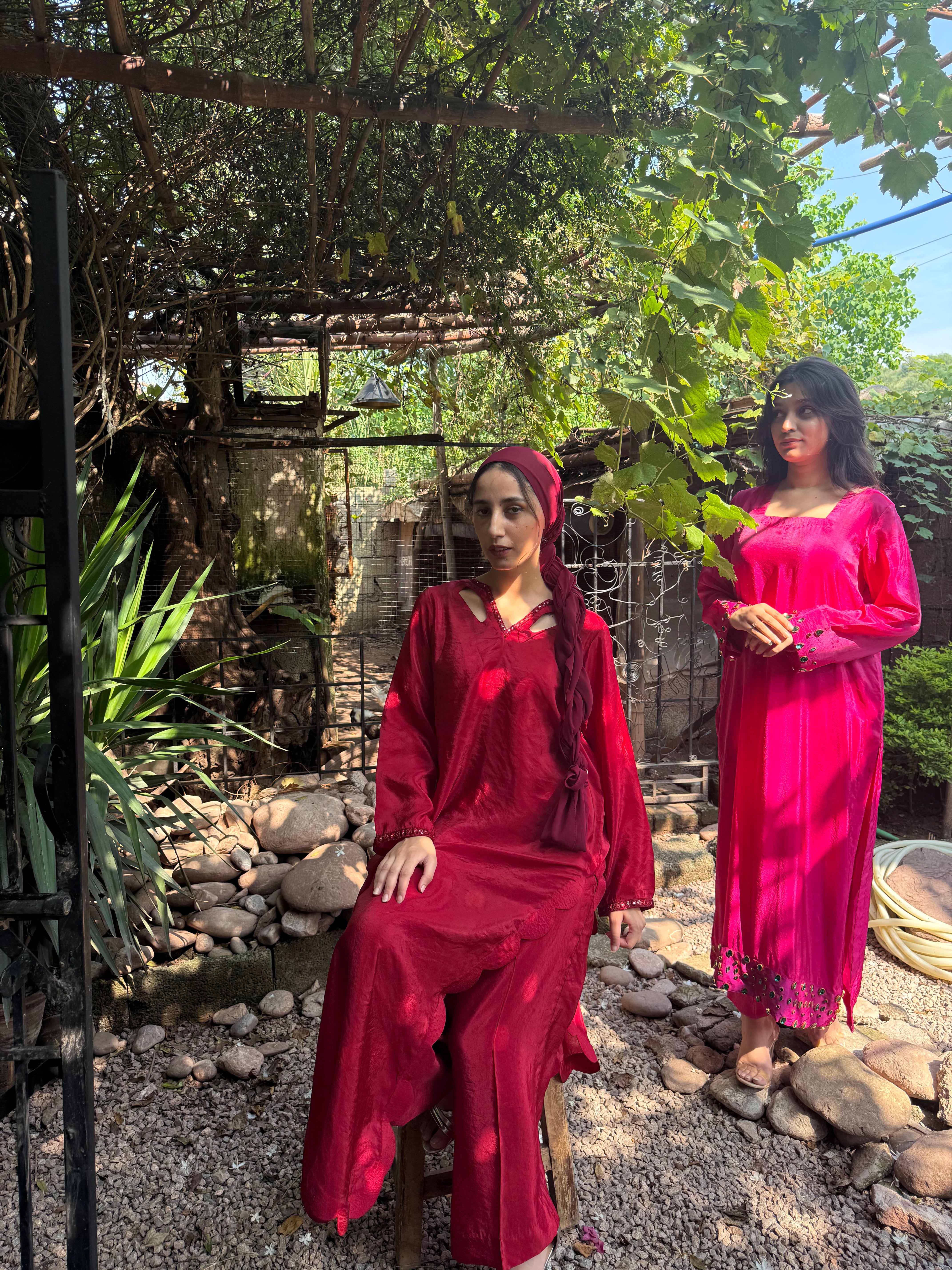 The outfit is a beautiful blend of traditional elements with a modern twist. The rich maroon top, adorned with delicate embellishments, is perfectly paired with the flowing gold trousers. It...