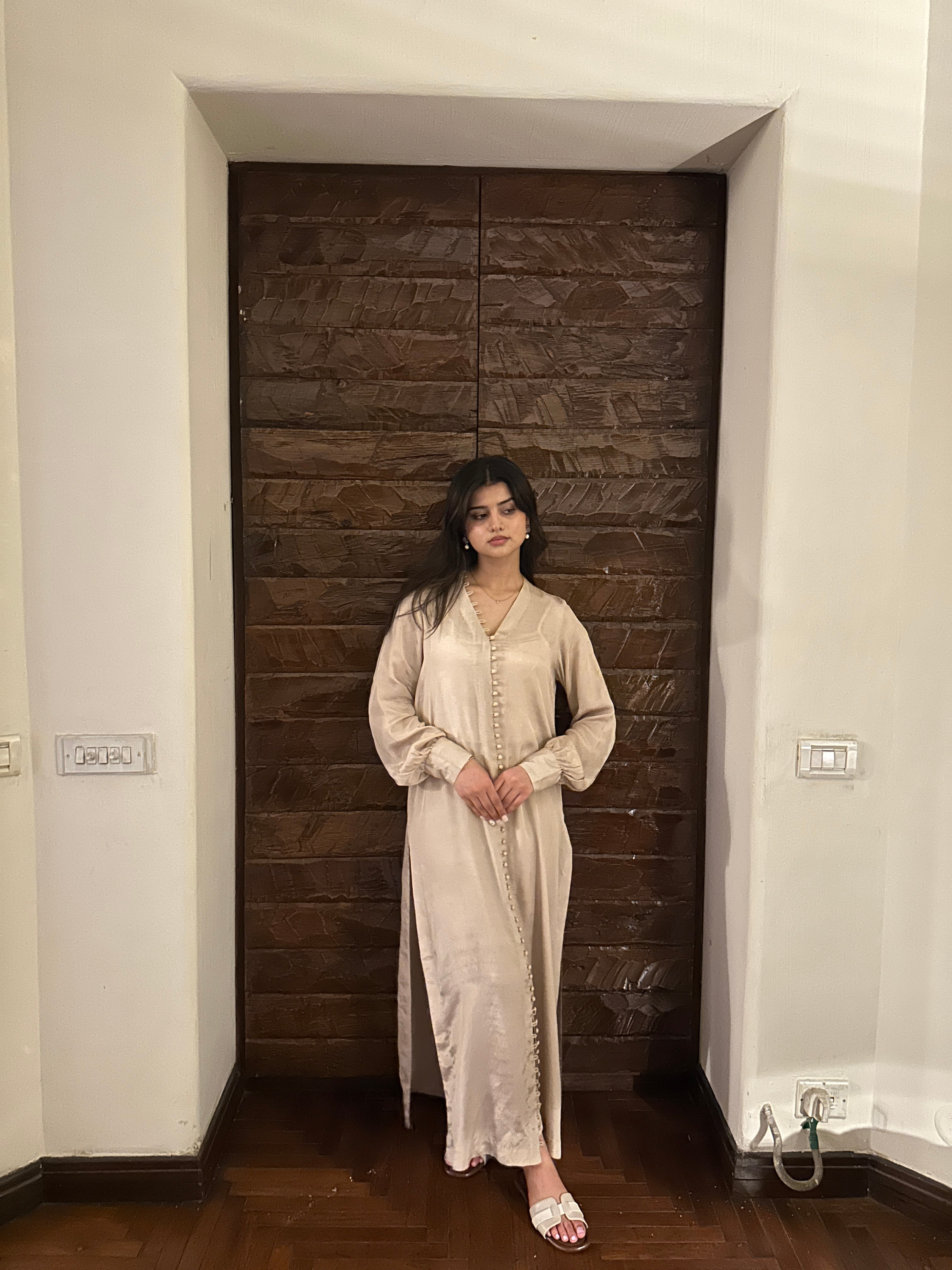 The dress is a vision of simple elegance. The neutral shade and clean lines create a timeless look, and the button detailing adds a touch of sophistication.Add with every outfit- Please...