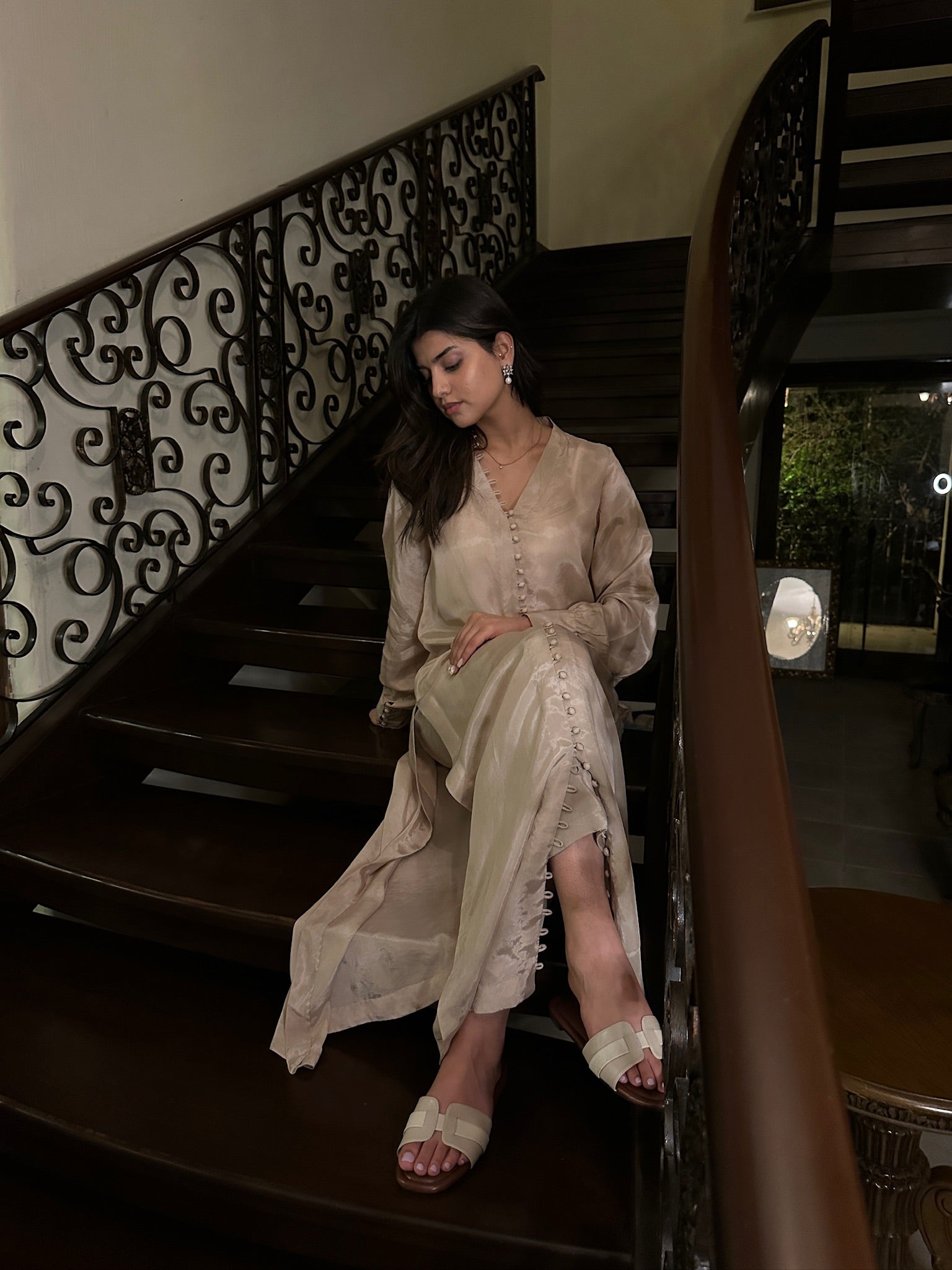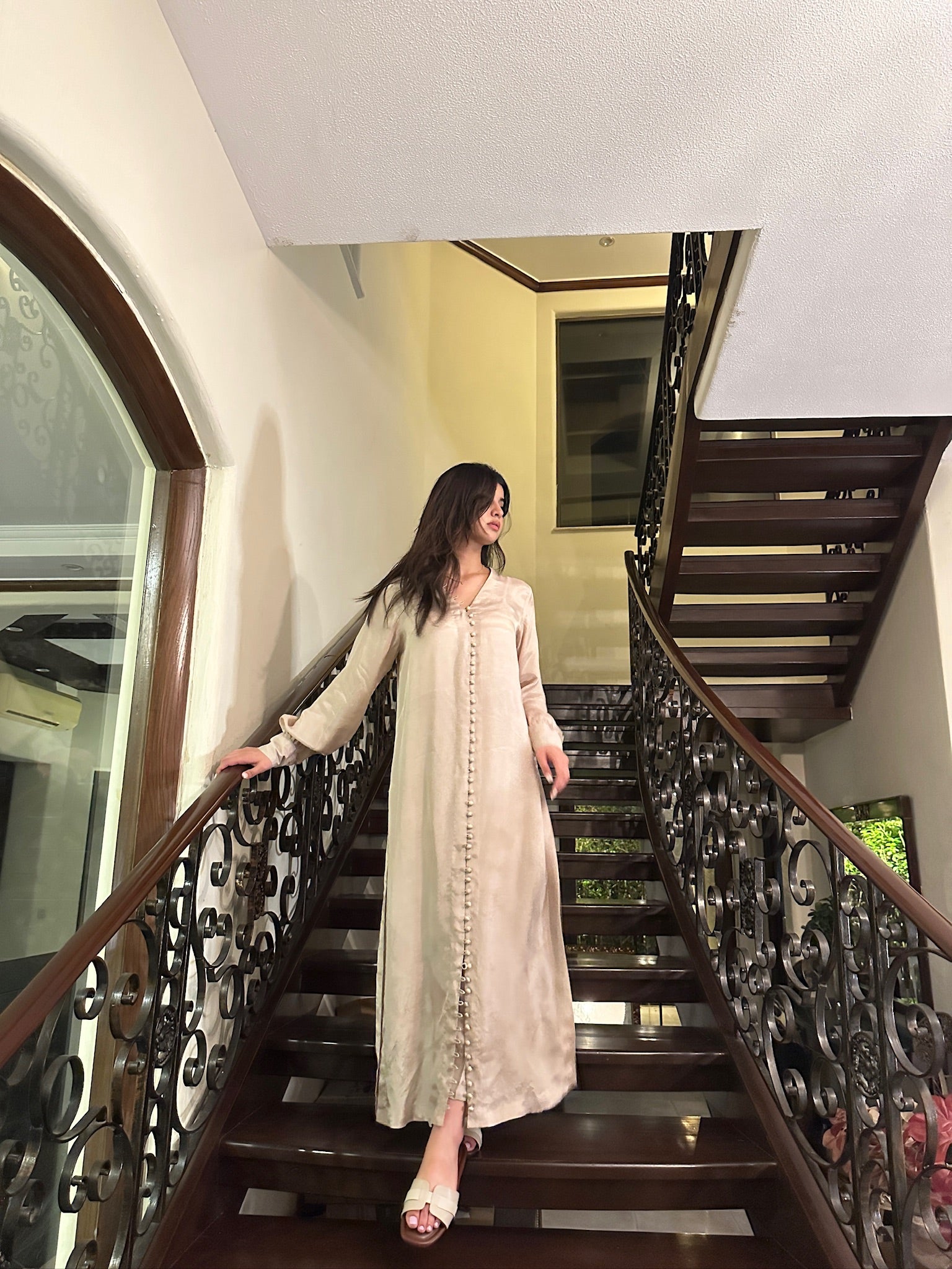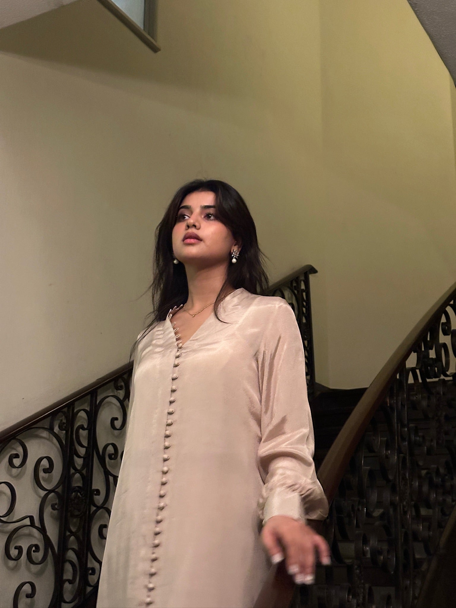 The dress is a vision of simple elegance. The neutral shade and clean lines create a timeless look, and the button detailing adds a touch of sophistication.