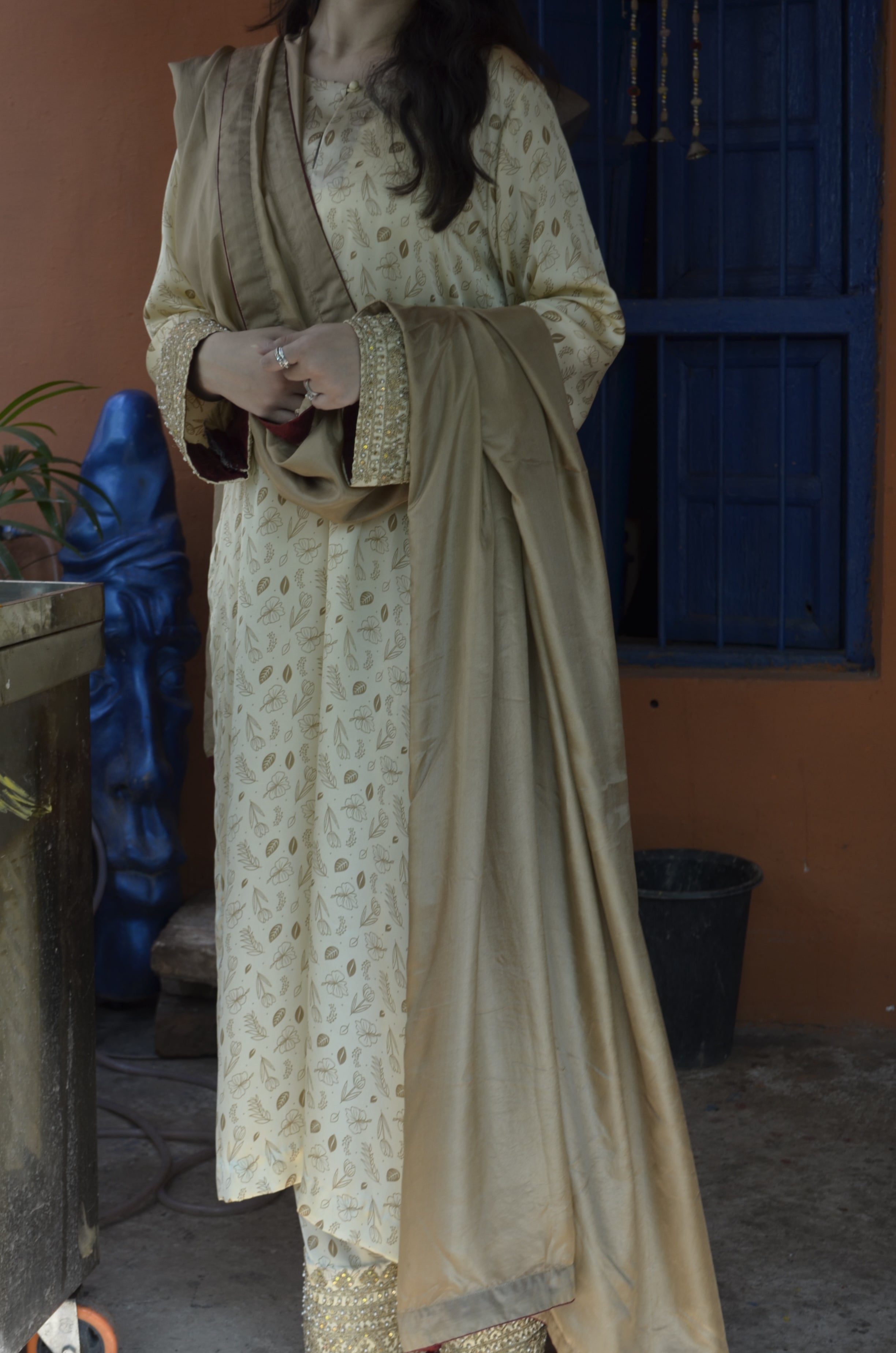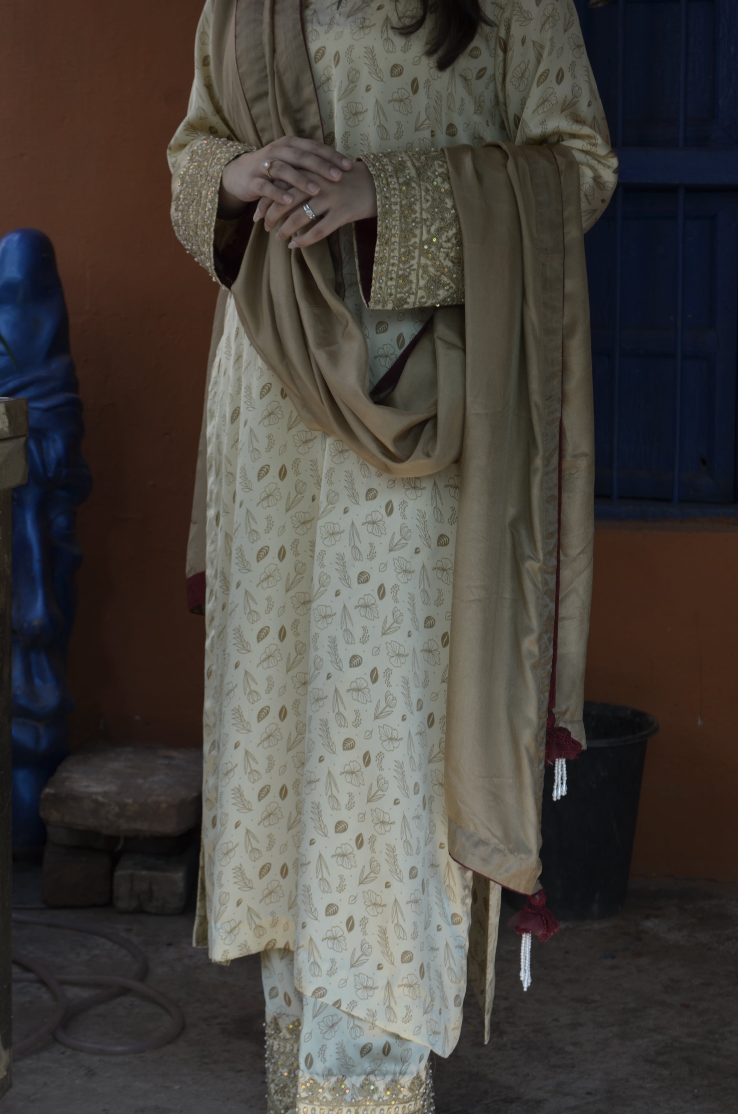 Bathed in a warm, neutral palette, this ensemble exudes understated elegance. The softly patterned tunic is complemented by a matching dupatta. Embellishments on the sleeves and the trousers add a touch of subtle refinement.