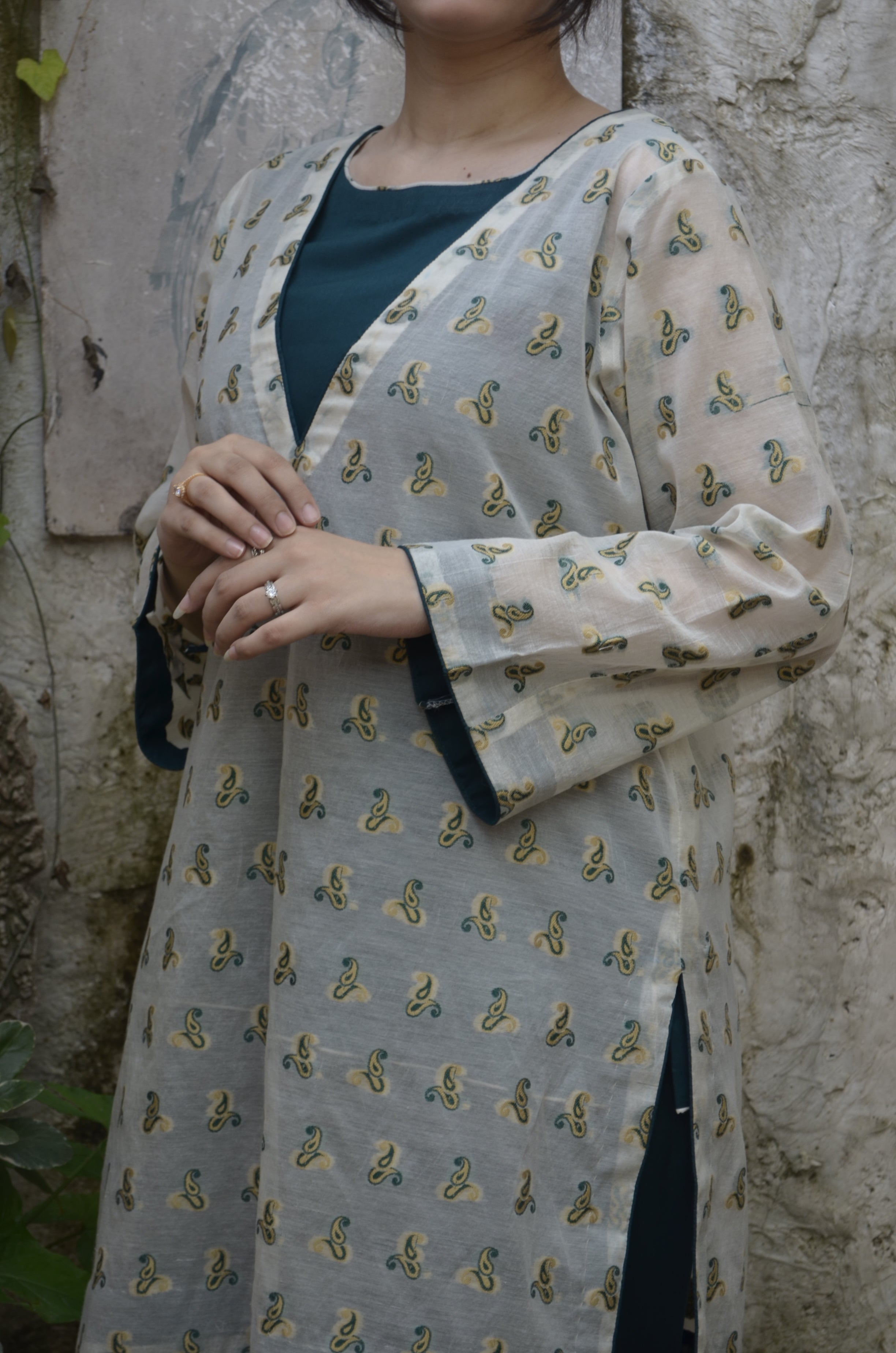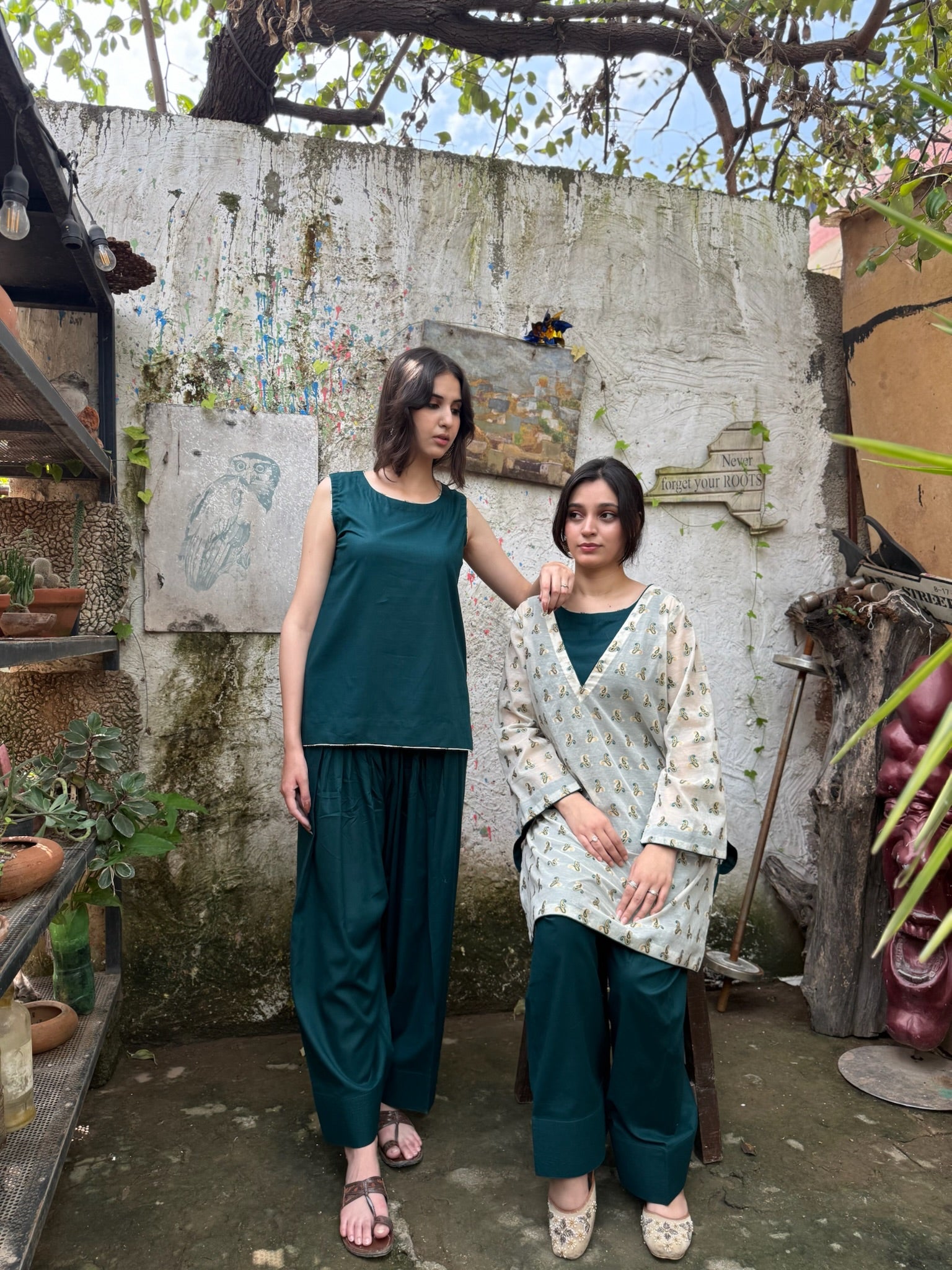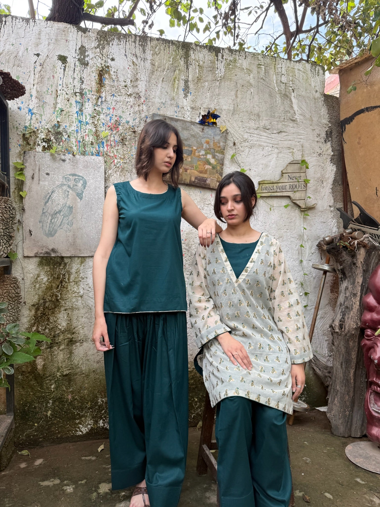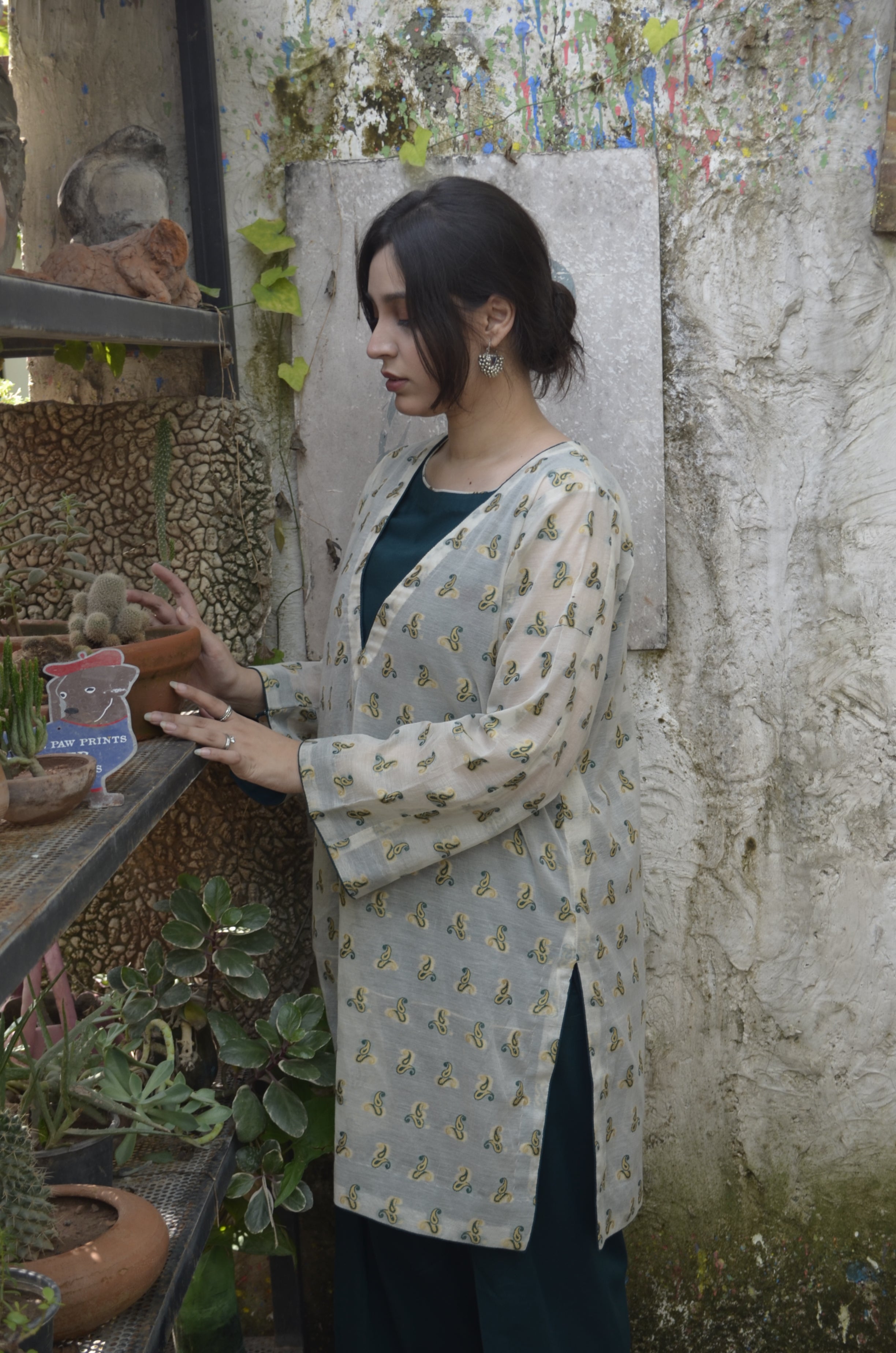Crafted in a serene palette, a deep green farshi shalwar set forms the base of this ensemble, crafted for fluid elegance and everyday ease. Layered with an off-white printed overshirt, it offers versatile styling — refined with the layer, effortless without it. A soft daywear pairing that blends relaxed structure with contemporary charm, designed for adaptable modern living.