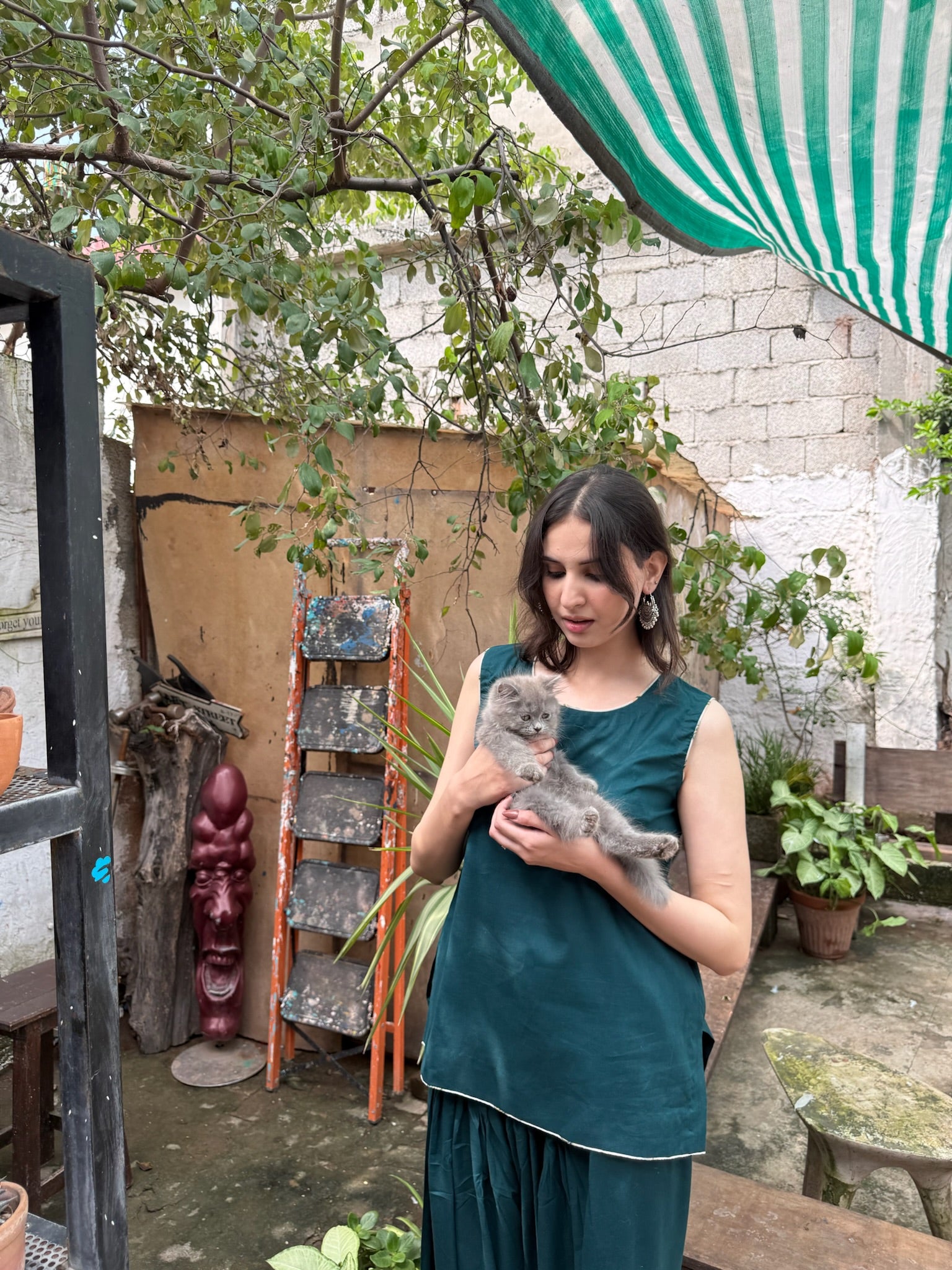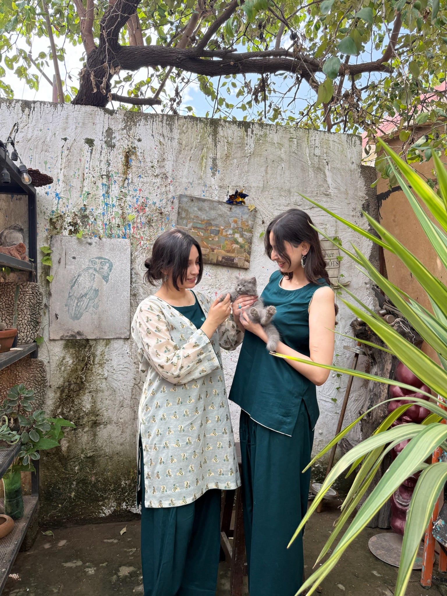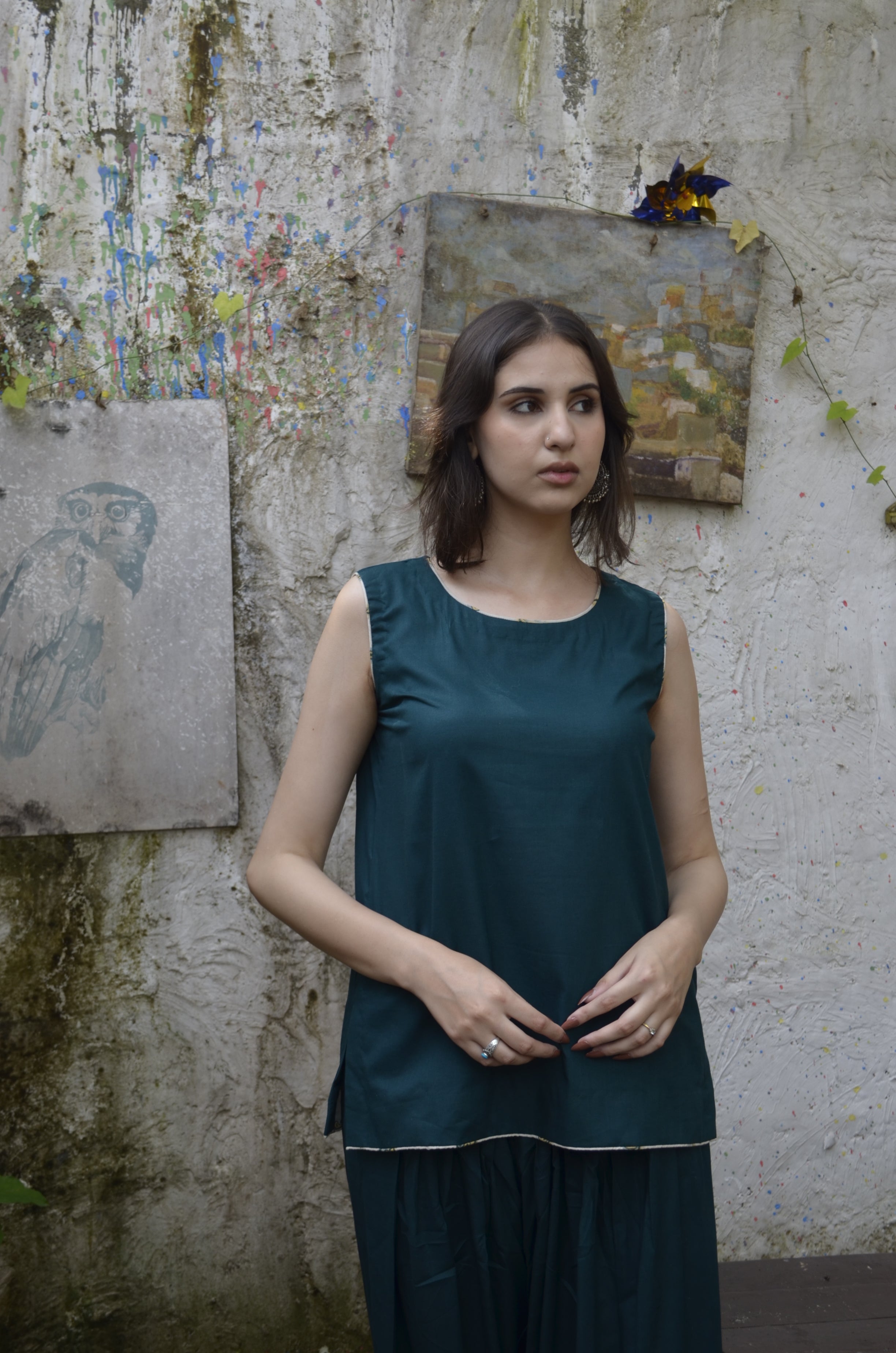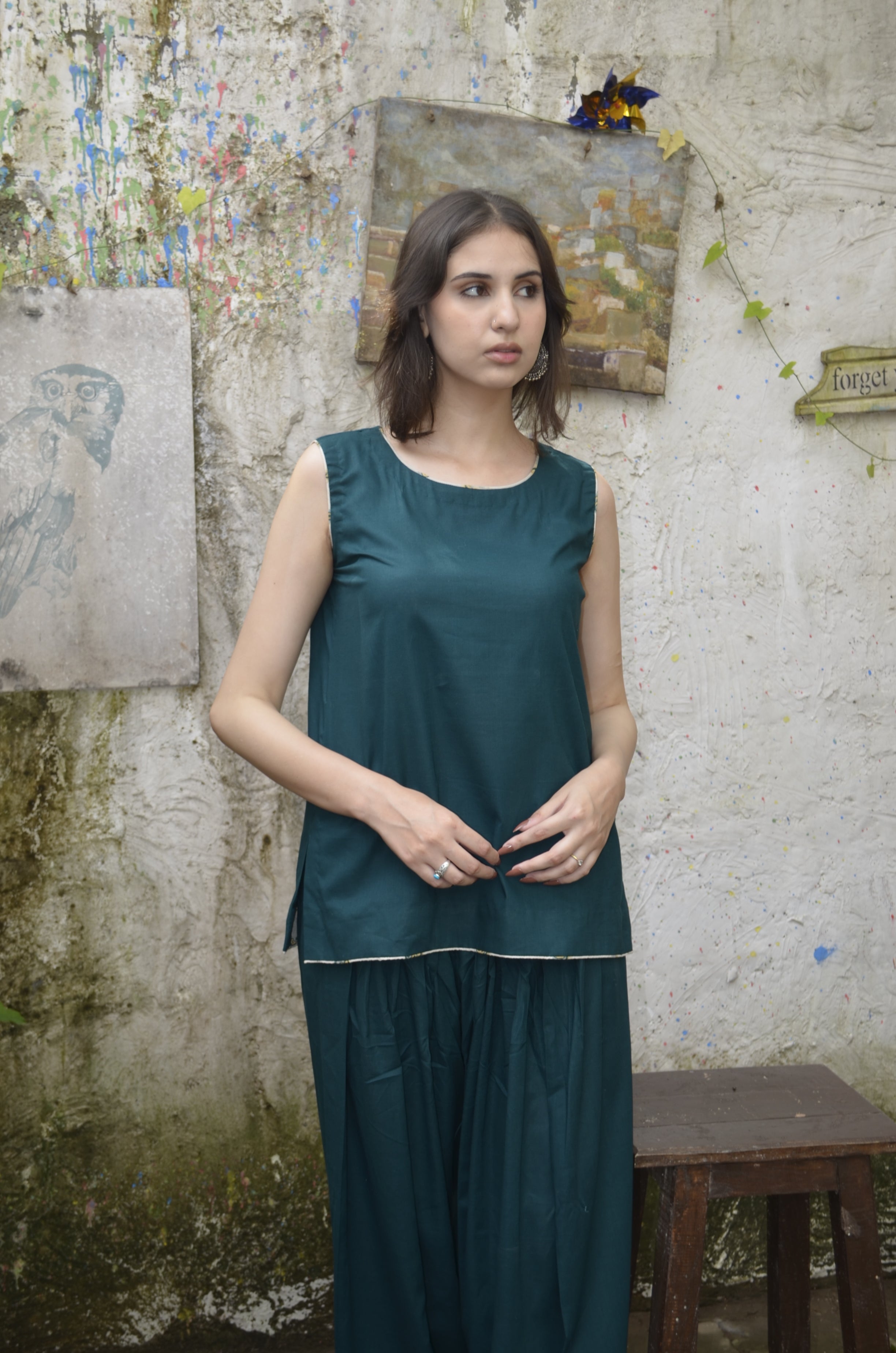 Crafted in a serene palette, a deep green farshi shalwar set forms the base of this ensemble, crafted for fluid elegance and everyday ease. Layered with an off-white printed overshirt, it offers versatile styling — refined with the layer, effortless without it. A soft daywear pairing that blends relaxed structure with contemporary charm, designed for adaptable modern living.