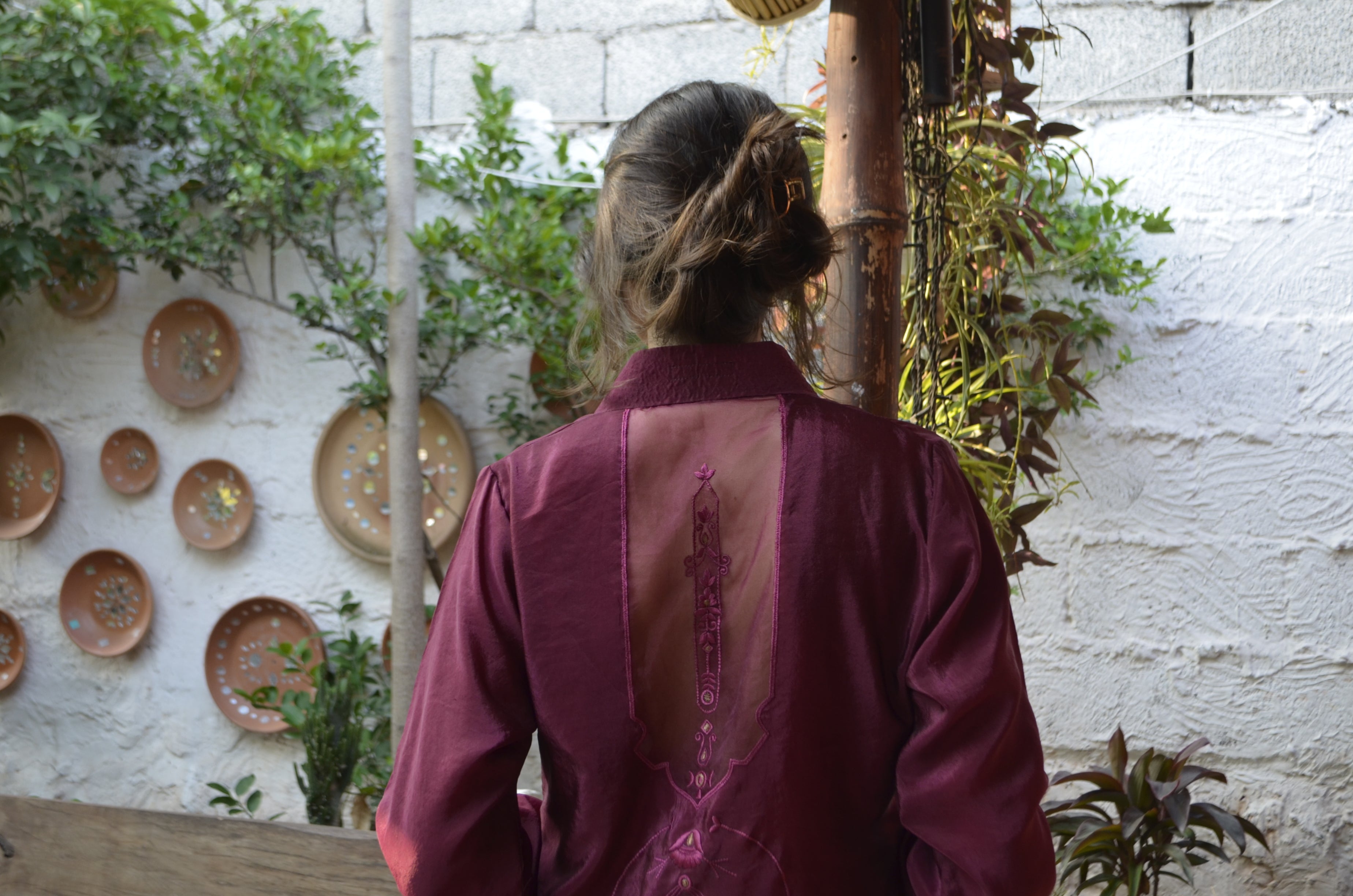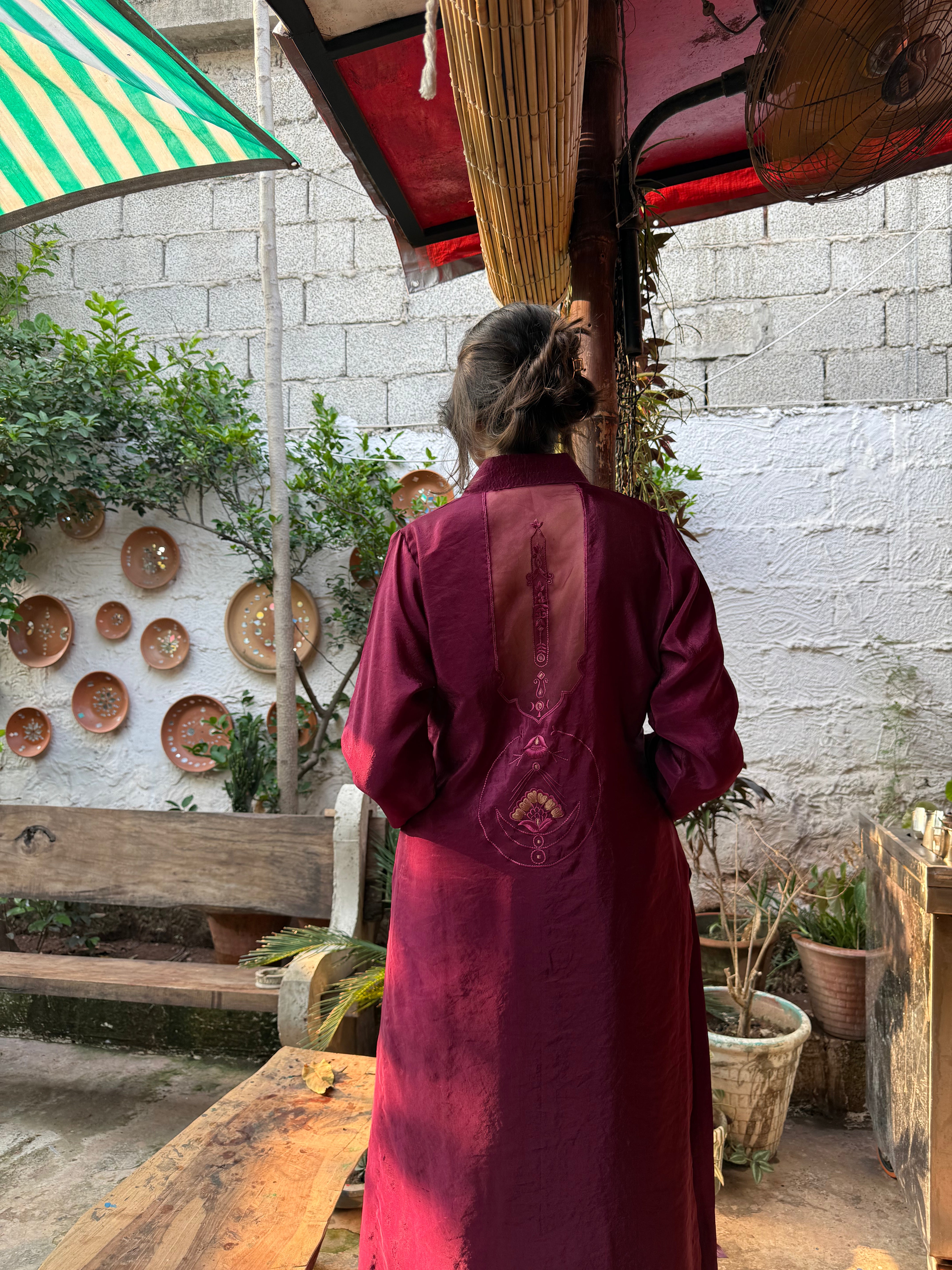Zar presents a burgundy canvas for modern sophistication. Featuring a looped neckline and ban, enhanced by a brown back panel and gold detailing. Effortlessly blending function.